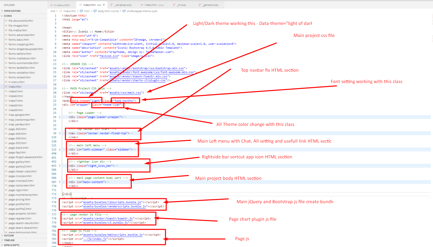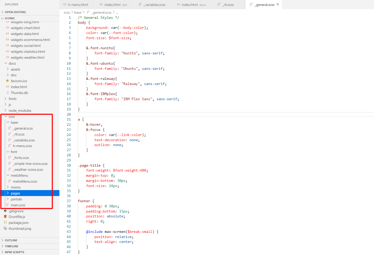 ICONIC/ ├──dist │ ├─assets/ │ ├─├─bundles/ │ ├─├─css/> │ ├─├─images/ │ ├─├─vendor/ │ ├─HTML pages/ ├──docs ├──fonts ├──js/ ├──node_modules ├──scss/ │ ├─base/ │ ├─font/ │ ├─metisMenu/ │ ├─mixins/ │ ├─pages/ │ ├─partials/ │ ├─main.scss/ ├──.gitignore ├──Gruntfile.js ├──package.js